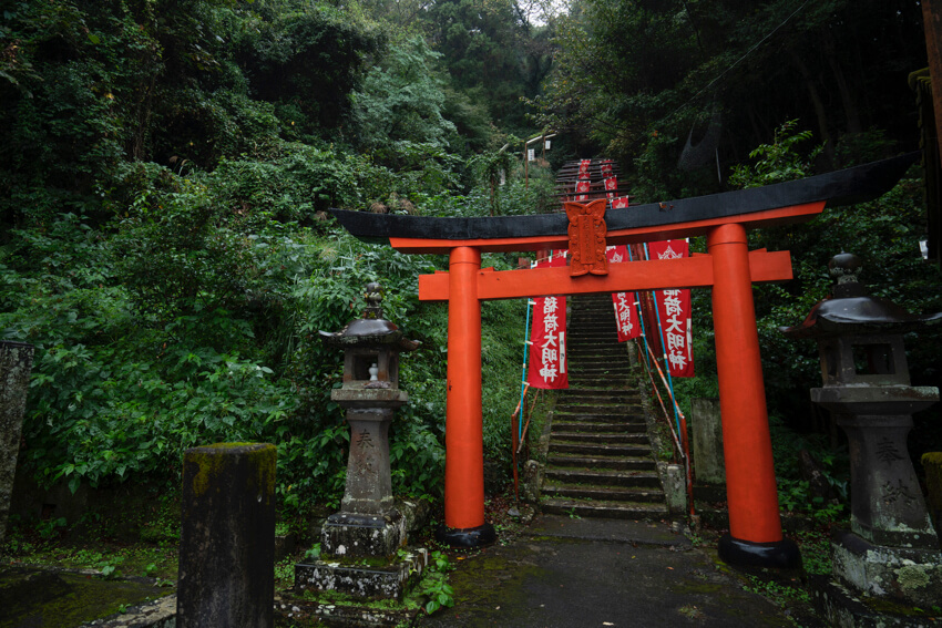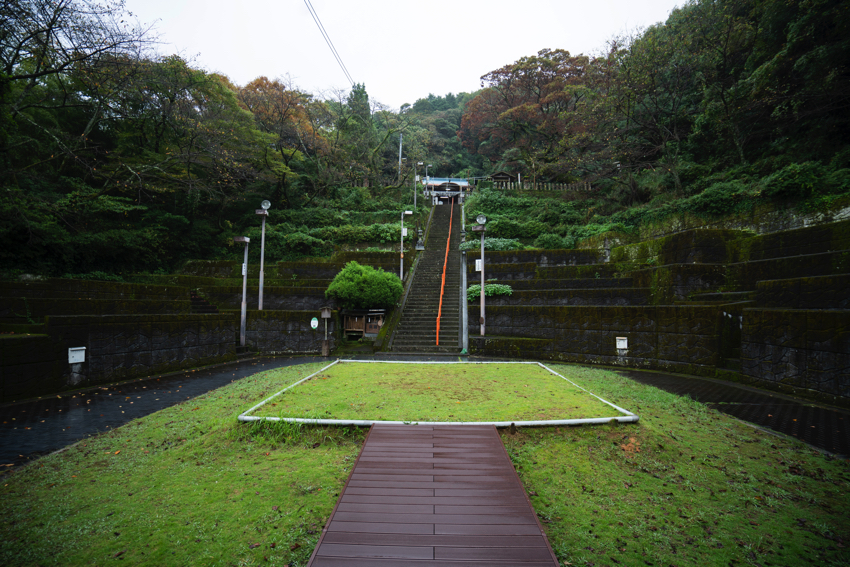 今から600年前、孝行息子が神様のお告げを受けて発見したという日奈久温泉。その神様をまつる高台の神社。